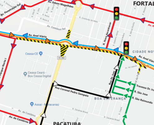 Outra alteração é para quem vem no Anel Viário, no sentido BR-116/CE-060 e quer ir à Pajuçara. O desvio deve ser à direita na Rua Novo Amanhecer e, em seguida, à esquerda na avenida Radialista João Ramos.