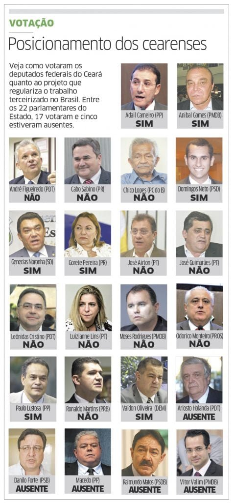 Ele foi apoiado por outros governistas. “O que estamos fazendo aqui é regulamentar, é dar mais uma opção para que o trabalhador trabalhe com dignidade”, disse Mauro Pereira (PMDB-RS). “O Brasil não pode mais se render a esse anacronismo ideológico”, afirmou Marcus Pestana (PSDB-MG).