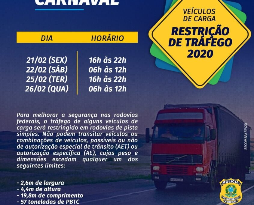 A fim de promover a fluidez do trânsito em grandes feriados, quando há maior movimentação nas estradas, a Polícia Rodoviária Federal publicou a PORTARIA Nº 126, DE 18 DE DEZEMBRO DE 2019 sobre a restrição do trânsito de Veículos e Combinações de Veículos excedentes em peso e ou dimensões aos limites máximos estabelecidos pela Resolução nº 210/2006, do Conselho Nacional de Trânsito e suas alterações, passíveis ou não da concessão de Autorização Especial de Trânsito – AET ou Autorização Específica – AE, em rodovias federais, nos períodos dos feriados previstos para o ano de 2020.